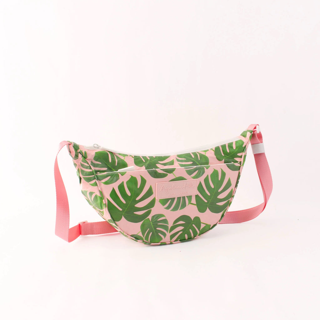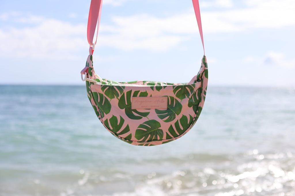 Bring a touch of the tropics everywhere you go with this vibrant crossbody bag, featuring lush Monstera leaves photographed right in my backyard in Haiku, Maui. The soft pink background makes the bold green leaves pop, while the vivid pink strap adds a fun, playful flair.